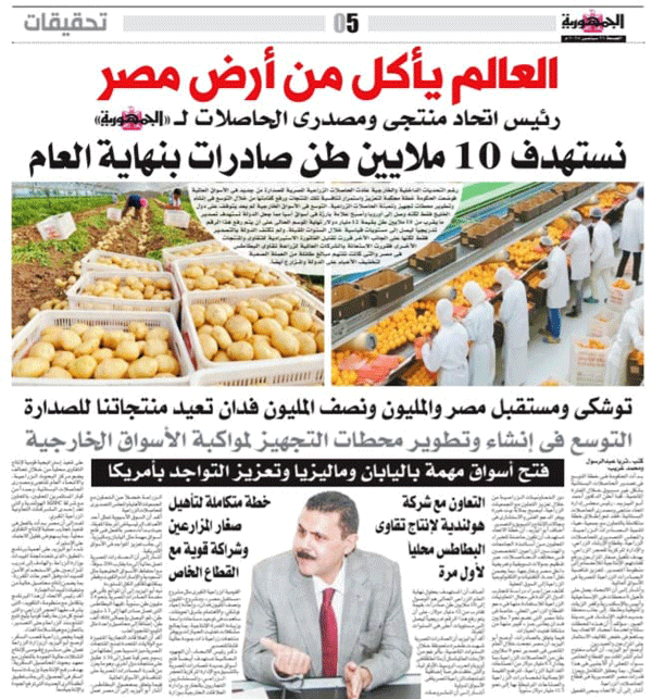 أجرت جريدة الجمهورية حديثاً مع الأستاذ الدكتور/أحمد أبو زيد رئيس مجلس إدارة الاتحاد العام لمنتجي ومصدري الحاصلات البستانية.